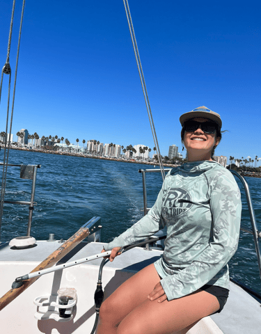 The day quickly became a lesson in being careful what you wish for. Before we knew it, we were heeled over in 22kts gusts––sounds great, right? Unfortunately, we had to set our course to get around the behemoth peninsula of Palos Verdes, so making any use of the wind sent us hurtling perpendicular to where we needed to go. VMG was negatory.